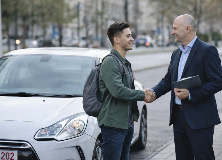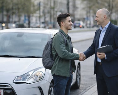A smiling driving instructor handing car keys to a happy young student outside a driving school.