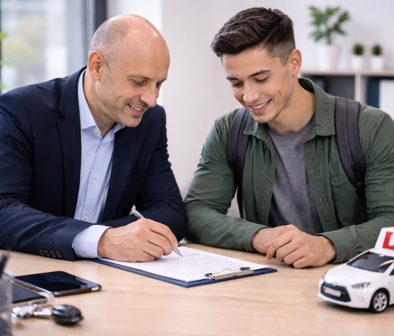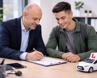 Close-up of a confident student driver sitting in a car, ready for a lesson.